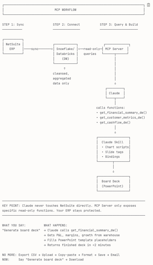 - Security: This is done by routing Claude -> MCP Server -> Data Warehouse–>ERP, ensuring Claude never touches raw ERP/NetSuite transaction data directly.